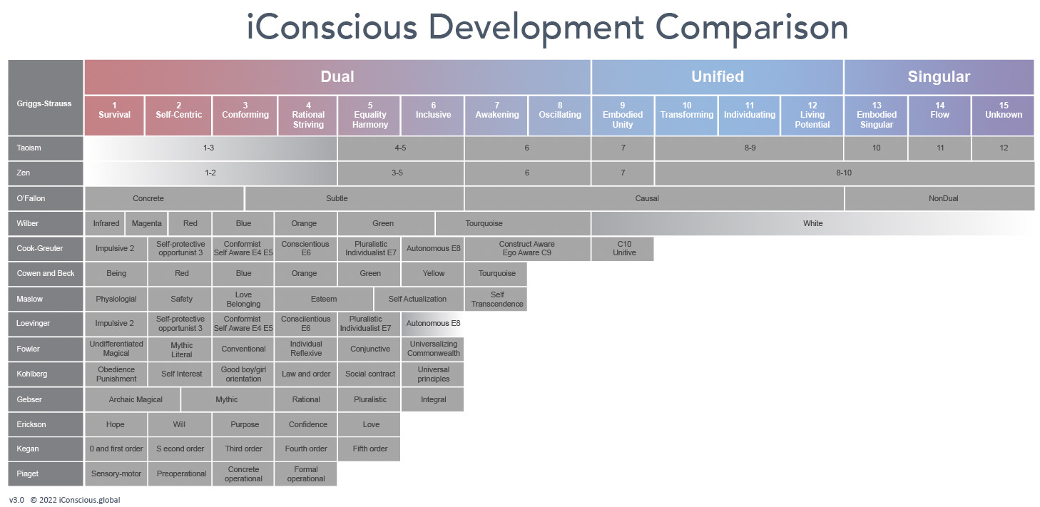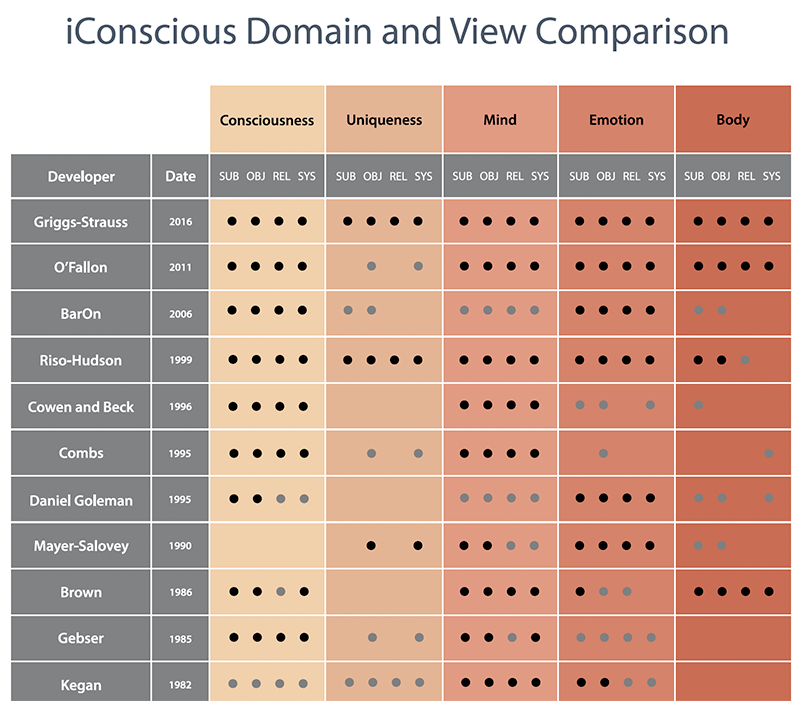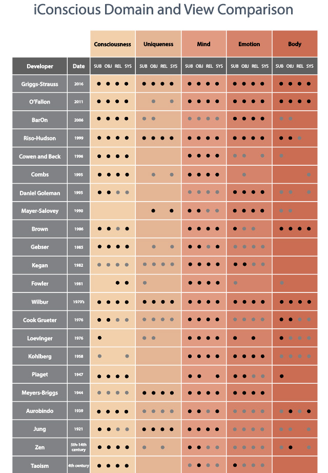 Cook-Greuter (1999, p 14) elucidates human development models and how they tend to deal specifically with one of three branches. Those three theories are usually based on 1) “phases” of development (by age ranges), 2) traits according to personality, and 3) stage theories according to meaning making, ego development, and identity evolution. The iConscious model is relatively age-independent, and focuses on how identity shifts, and how those changes affect human needs and development in all domains - including personality - both individually and relationally. We find that most human development theories, models, and research separate consciousness evolution from growth in the human domains. Also, in the human domains, different researchers have focused on different “lines” or aspect of development. The iConscious Human Development Model integrates these perspectives and provides a framework for all age-independent models.